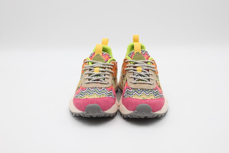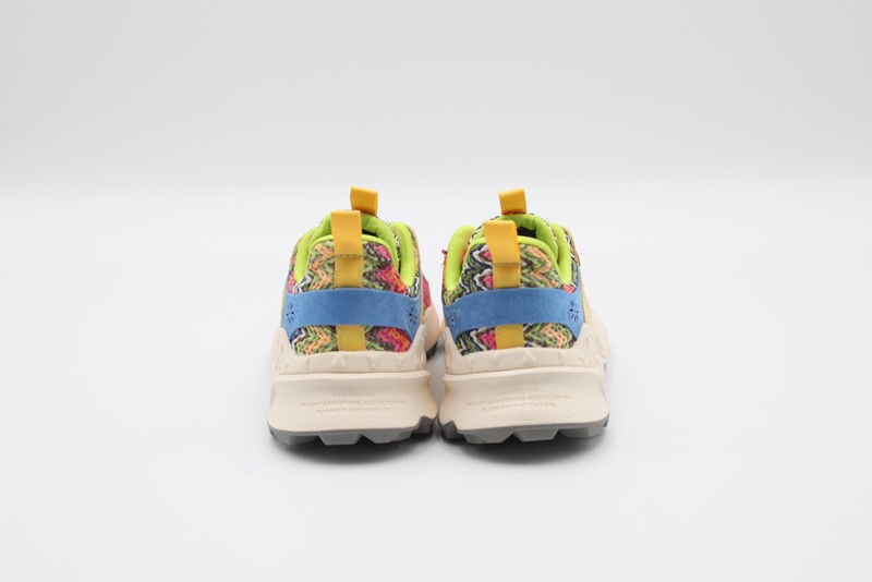 Sneaker in tessuto a maglia con ricami geometrici e inserti in suede. Stringhe trekking e occhiello sagomato. Fodera in tessuto e soletta interna in sughero. Fondo in gomma ultra leggera con sagomature e mescola bicolor.