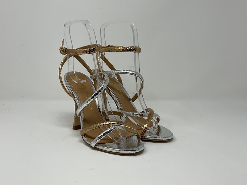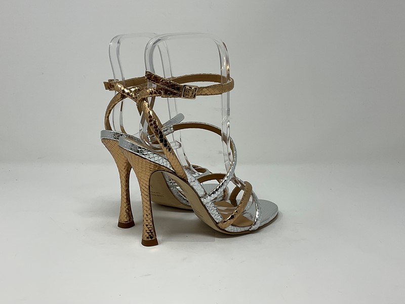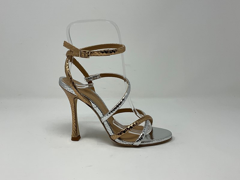 Sandalo con cinturini in pelle stampa vipera. Tacco rivestito H. 11 Colore Oro giallo e Argento Made in Italy