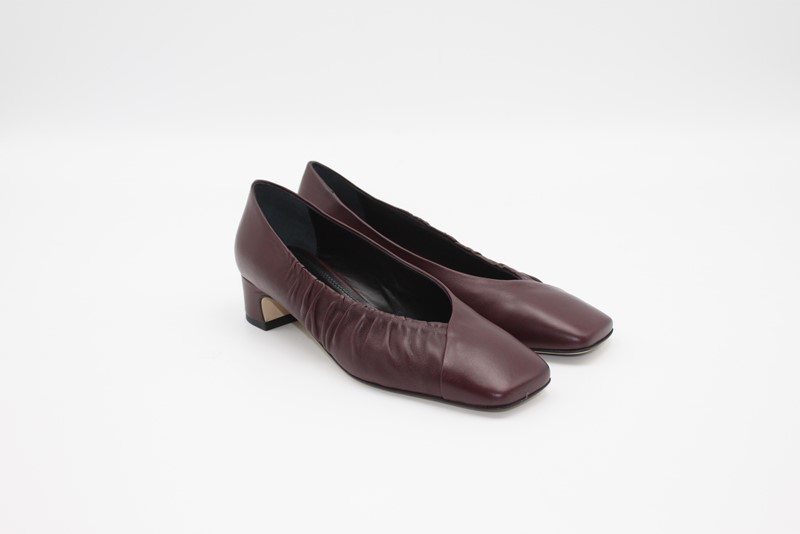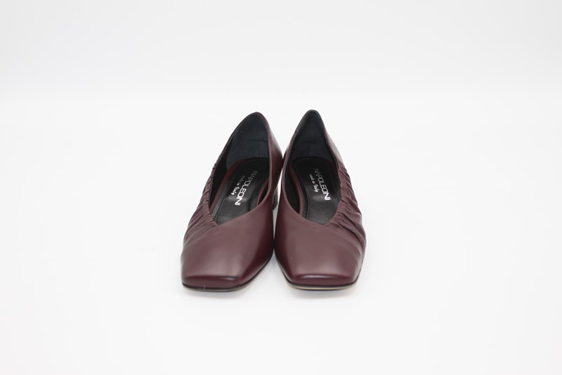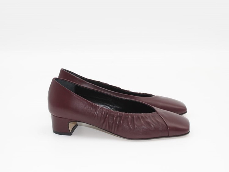 Decolletè in pelle punta quadra con arricciatura Colore Bordeaux Tacco rivestito, H. tacco 4 cm. Made in Italy