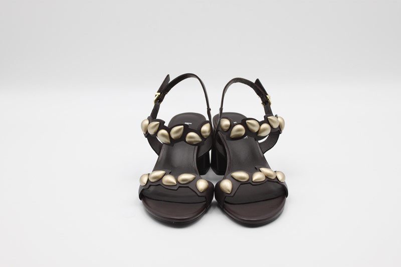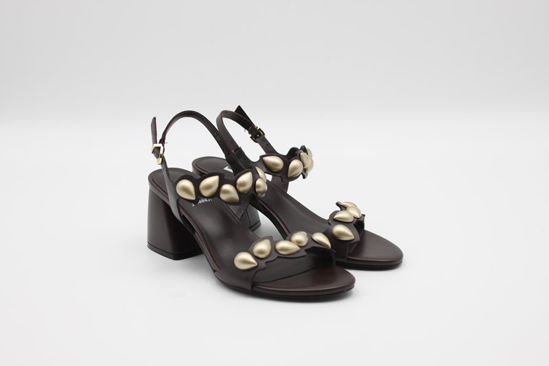 Sandalo in pelle con cinturino regolabile alla caviglia. Facescetta con borchie dorate H. tacco 75 Colore Cioccolato Borchie Oro satinato