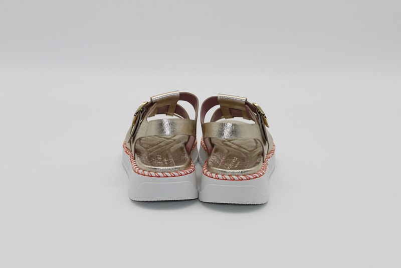 Sandalo mascherina ragnetto sportivo in pelle laminata cinturino regolabile con fibbia oro. Para diritta bianca con cucitura a contrato arancio, fondo dentellato Colore Oro H. para 4 cm. Made in Italy