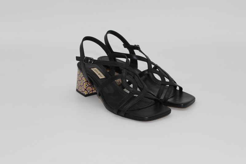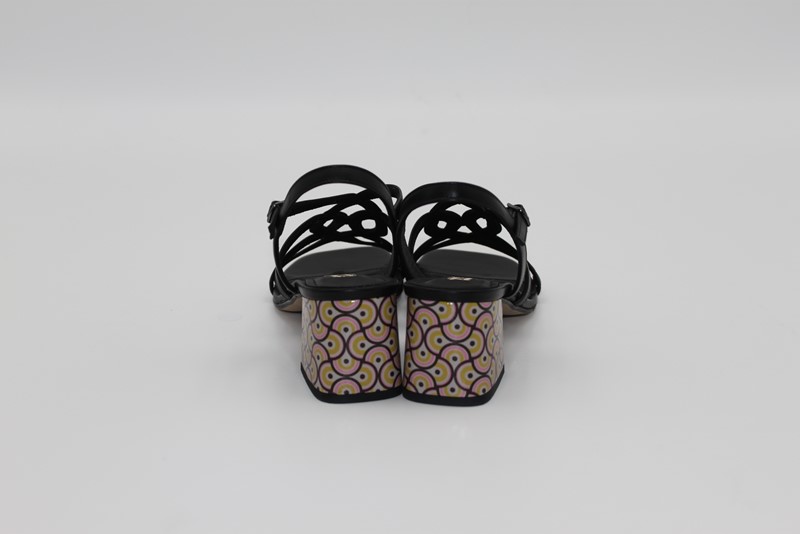 Sandalo con cinturini, regolabile alla caviglia Tacco rivestito stampa geometrica H 5 cm. Colore tomaia Nero Made in Italy
