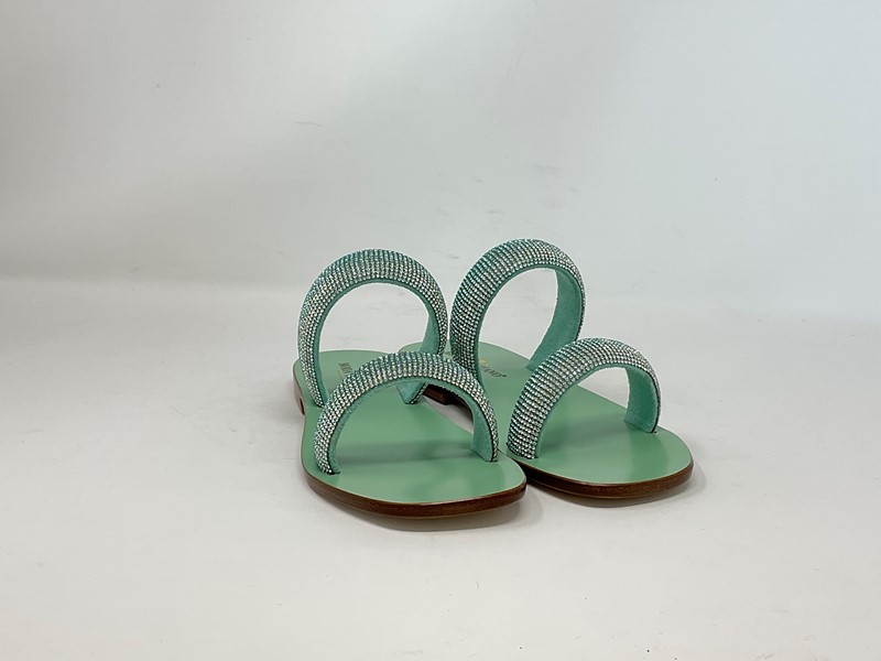 Sandalo in cuoio con doppia fascia in strass Colore Acquamarina Suola in tinta H. tacco 2 cm. Made in Italy