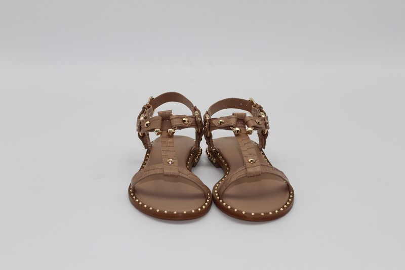 Sandalo Ash Tomaia, pianta e fondo in pelle. Cinturino sul dorso e alla caviglia con fibbia. Borchie applicate su tomaia e bordo pianta. Tacco 20mm. Colore Sand/Oro Codice articolo: S24-PATSY02